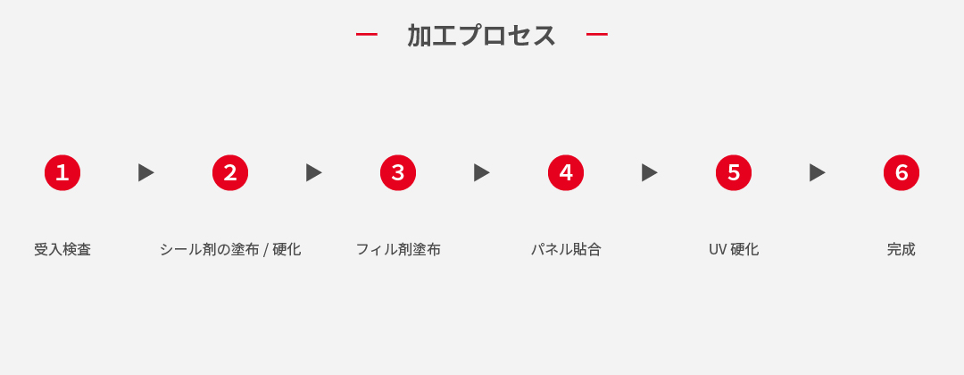 一般的なOCRの貼合には、真空貼りやオートクレーブを使用する事が多いですが、弊社の場合は大気貼りにこだわり、オートクレーブを使用しません。液晶モジュールやタッチパネルへのダメージを気になさるお客様からご好評を得ております。