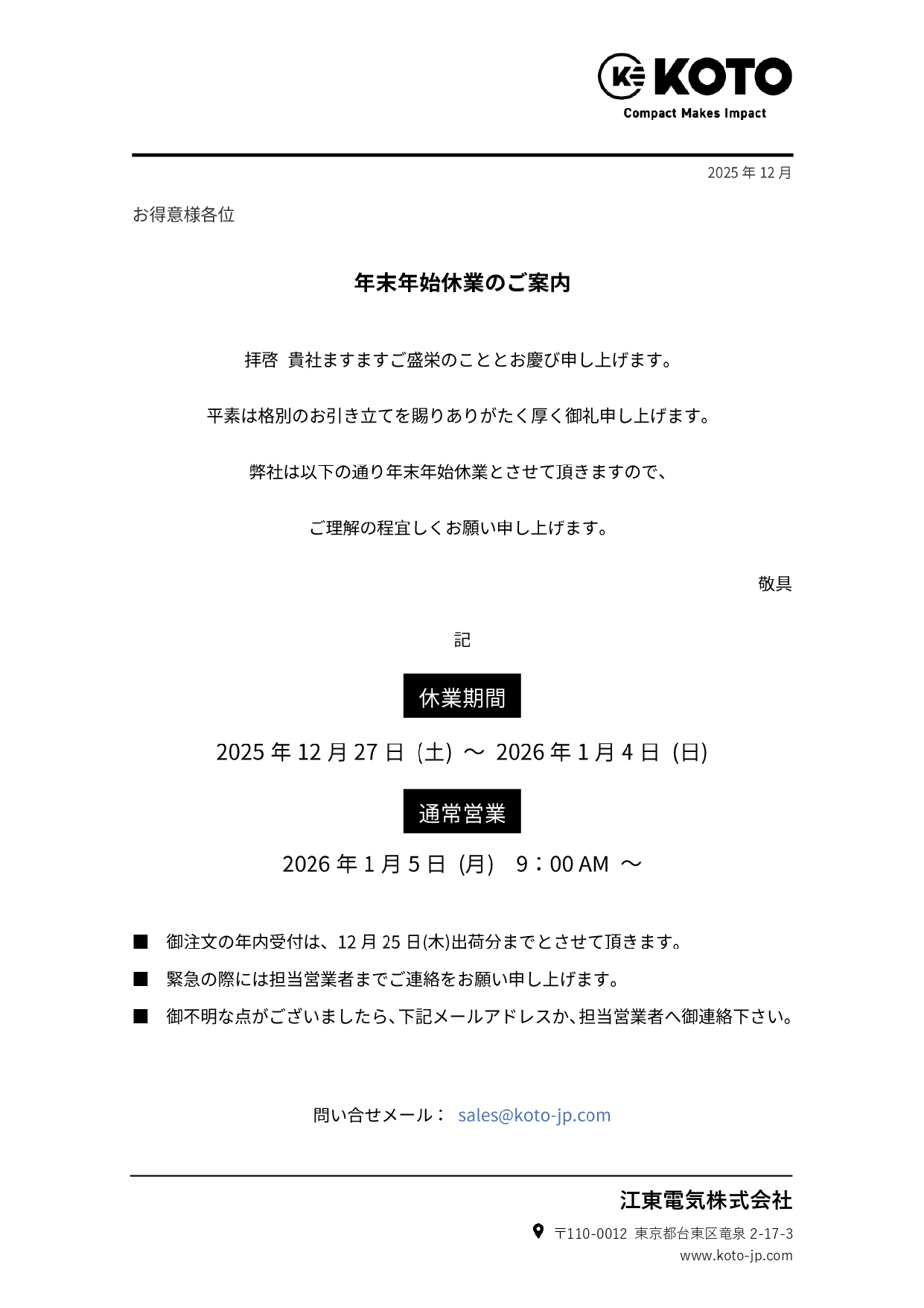 年末年始のご案内